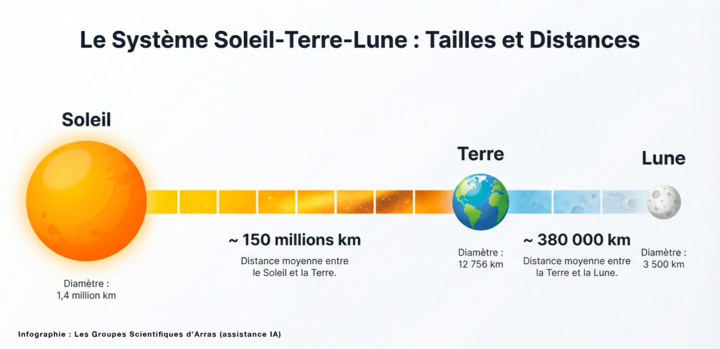 Notre satellite naturel, formé il y a environ 4,5 milliards d’années (probablement suite à une collision cataclysmique entre la jeune Terre et un objet de la taille de Mars), mesure « seulement » 3 474 kilomètres de diamètre. Elle orbite autour de nous à une distance moyenne de 384 400 kilomètres. La Lune est le seul astre extraterrestre sur lequel des êtres humains ont posé le pied, et malgré sa taille modeste comparée au Soleil, c’est elle qui va jouer le rôle principal dans notre histoire d’éclipse. Comment ? C’est ce que nous découvrirons dans le prochain épisode !