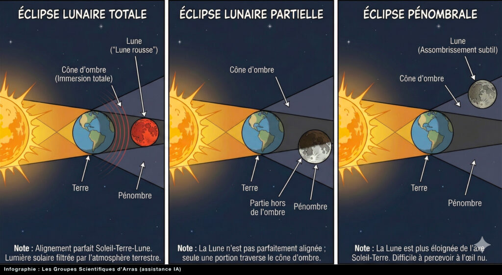 L’éclipse lunaire se décline en plusieurs variantes. Lors d’une éclipse lunaire totale, la Lune plonge entièrement dans le cône d’ombre de la Terre et prend alors une teinte cuivrée, parfois rouge sang, qui lui vaut le surnom poétique de « Lune rousse ». Cette coloration provient de la lumière du Soleil filtrée et déviée par l’atmosphère terrestre – comme si tous les levers et couchers de soleil de la planète se retrouvaient projetés sur la Lune. Lors d’une éclipse lunaire partielle, seule une portion de la Lune traverse le cône d’ombre, et l’on peut observer une « morsure » sombre qui grignote progressivement le disque lunaire. Enfin, l’éclipse pénombrale est la plus discrète : la Lune traverse uniquement la pénombre de la Terre (la zone où notre planète ne bloque que partiellement la lumière solaire), ce qui produit un assombrissement subtil, parfois difficile à percevoir à l’œil nu.