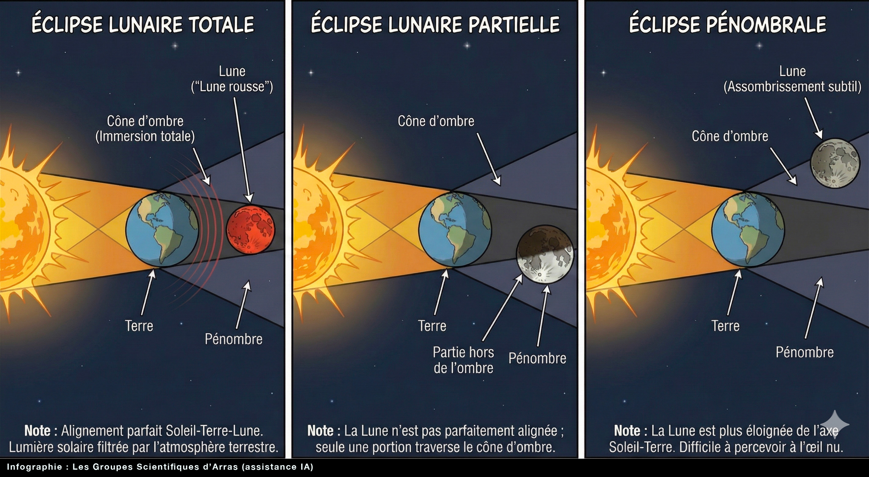 L'éclipse lunaire se décline en plusieurs variantes. Lors d'une éclipse lunaire totale, la Lune plonge entièrement dans le cône d'ombre de la Terre et prend alors une teinte cuivrée, parfois rouge sang, qui lui vaut le surnom poétique de « Lune rousse ». Cette coloration provient de la lumière du Soleil filtrée et déviée par l'atmosphère terrestre – comme si tous les levers et couchers de soleil de la planète se retrouvaient projetés sur la Lune. Lors d'une éclipse lunaire partielle, seule une portion de la Lune traverse le cône d'ombre, et l'on peut observer une « morsure » sombre qui grignote progressivement le disque lunaire. Enfin, l'éclipse pénombrale est la plus discrète : la Lune traverse uniquement la pénombre de la Terre (la zone où notre planète ne bloque que partiellement la lumière solaire), ce qui produit un assombrissement subtil, parfois difficile à percevoir à l'œil nu.
