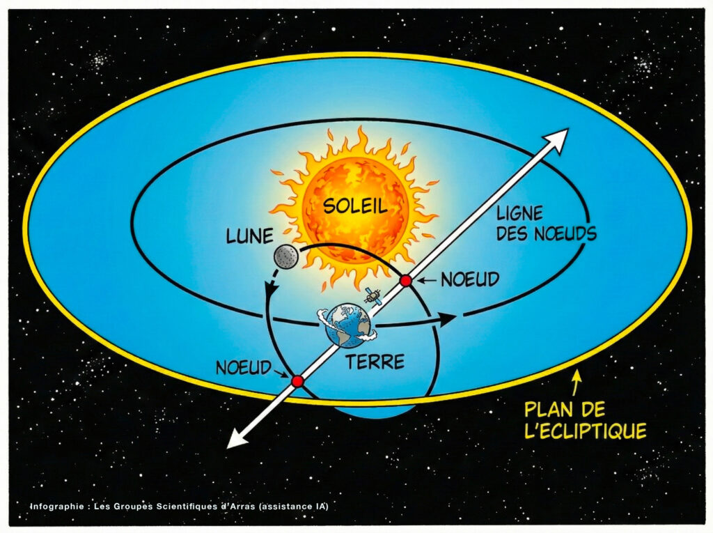 Les éclipses ne peuvent se produire que lorsque la Lune se trouve à proximité de ce qu’on appelle les « nœuds » de son orbite – les deux points où son trajet croise le plan orbital terrestre. Ces fenêtres d’opportunité, appelées « saisons des éclipses », surviennent environ deux fois par an et durent quelques semaines chacune. C’est uniquement pendant ces périodes que les conditions géométriques sont réunies pour qu’une éclipse puisse avoir lieu.