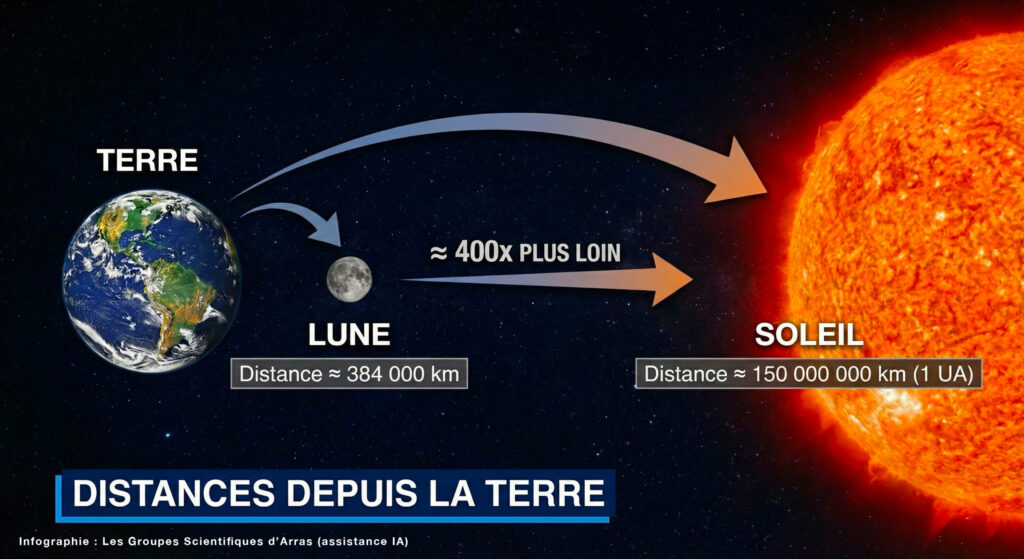 La réponse tient en un mot : distance. Le Soleil est certes gigantesque, mais il se trouve à 150 millions de kilomètres de nous (une unité astronomique ou UA). La Lune, elle, n’est qu’à 384 000 km en moyenne. Et là, accrochez-vous, parce que le hasard cosmique va vous surprendre : ce rapport de distance est aussi d’environ 400. La Lune est 400 fois plus petite, mais 400 fois plus proche. Résultat ? Dans notre ciel, les deux astres affichent pratiquement la même taille apparente : un demi-degré, soit à peu près la largeur de votre petit doigt tenu à bout de bras.
