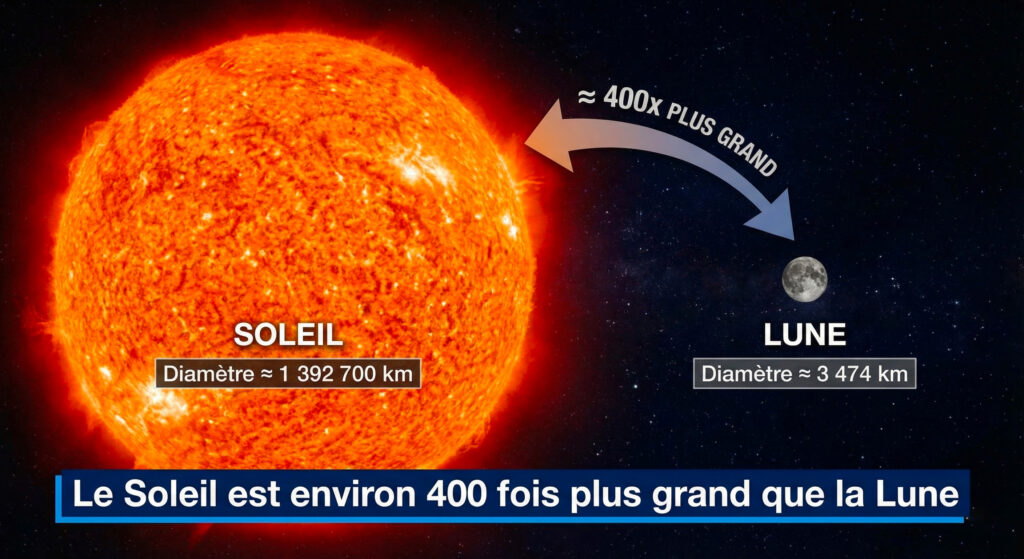Soyons honnêtes : sur le papier, ça ne devrait pas marcher. Le Soleil, c’est une boule de feu de 1,4 million de kilomètres de diamètre. La Lune ? À peine 3 474 km. Faites le calcul : notre étoile est environ 400 fois plus grande (en diamètre) que notre satellite. Autant demander à une pièce de monnaie de cacher un immeuble de 40 étages. Et pourtant, ça fonctionne. Comment ?