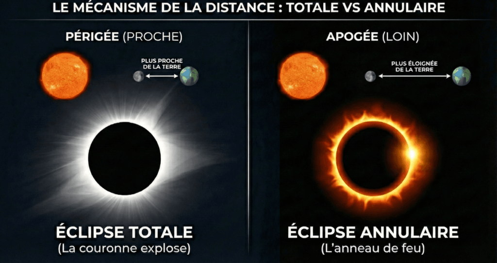 Et ça se corse encore. Même sur la trajectoire, tout dépend de la distance Terre-Lune ce jour-là. Quand notre satellite est proche (vers le périgée), son diamètre apparent suffit pour couvrir tout le Soleil : éclipse totale. Mais quand il est un peu plus loin (vers l’apogée), il paraît légèrement trop petit et laisse dépasser un fin anneau de lumière autour de lui. C’est ce qu’on appelle une éclipse annulaire. Bref, la « magie » des éclipses tient à une géométrie d’une précision redoutable. C’est exactement ce qui les rend si précieuses : un rendez-vous rare, au bon endroit, au bon moment.