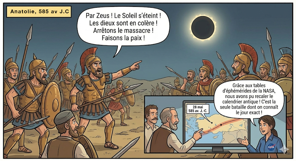 Le 28 mai 585 av. J.-C., Mèdes et Lydiens s’affrontent près du fleuve Halys en Anatolie, au terme de cinq ans de guerre indécise. En pleine bataille, une éclipse totale de Soleil transforme le jour en nuit, ce que les deux armées interprètent comme un avertissement des dieux : les combats cessent immédiatement et une paix est conclue, au point que l’épisode sera connu plus tard comme la « bataille de l’Éclipse ». Les historiens modernes ont utilisé les calculs d’éphémérides pour recaler le calendrier des événements antiques à partir de cette éclipse. Les tables de la NASA permettent d’identifier une éclipse totale visible en Anatolie à la date julienne du 28 mai 585 av. J.-C., ce qui fixe avec une précision étonnante l’un des rares événements militaires de l’Antiquité dont on connaisse le jour exact.